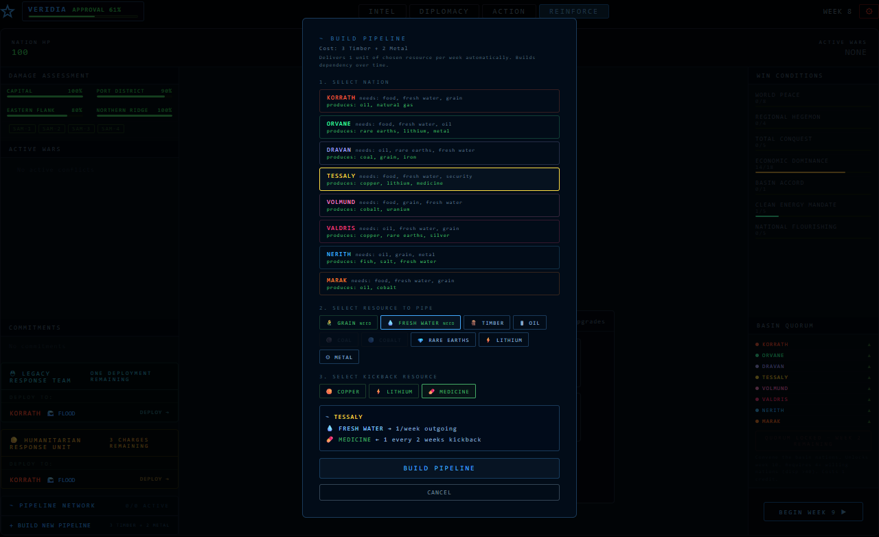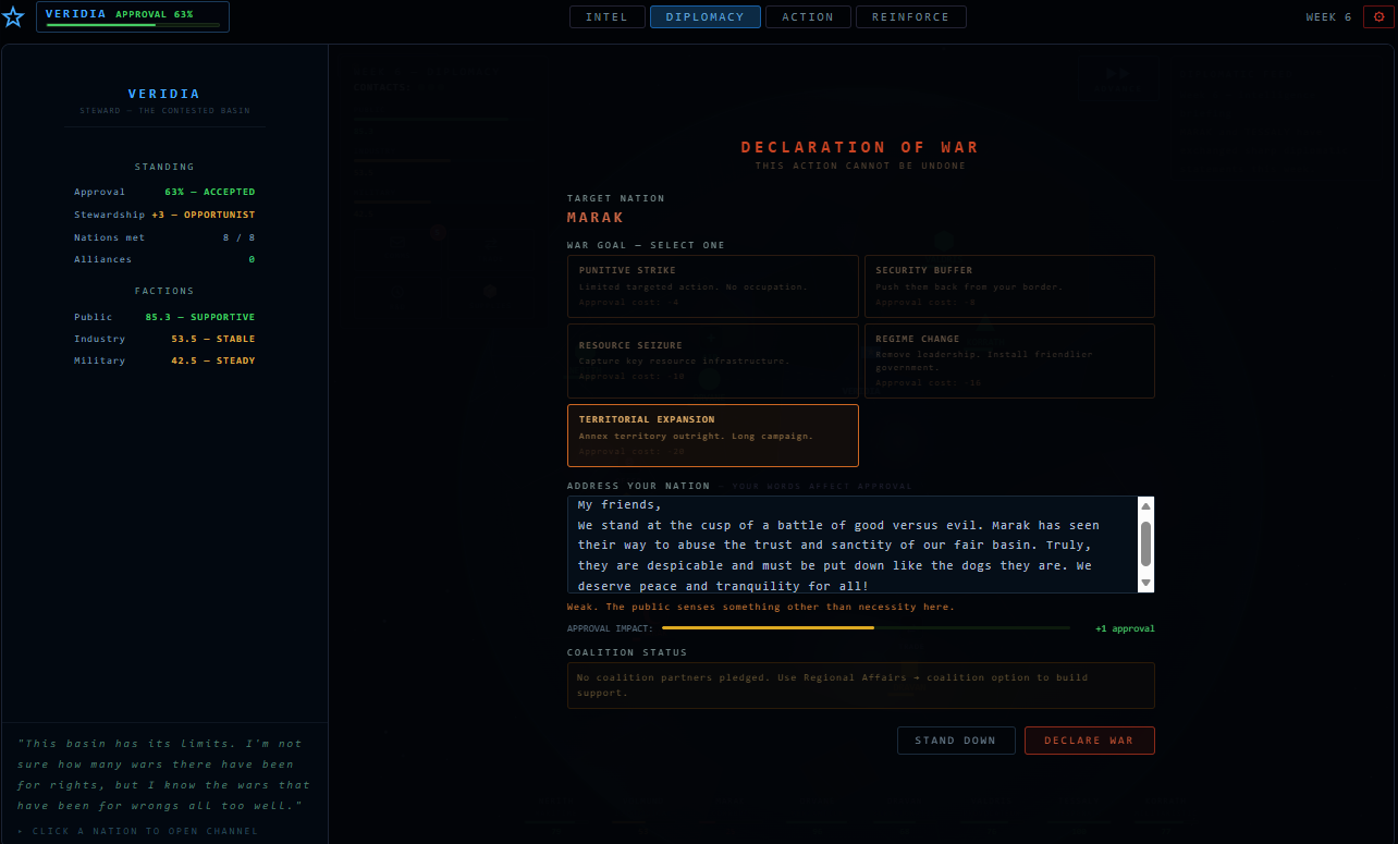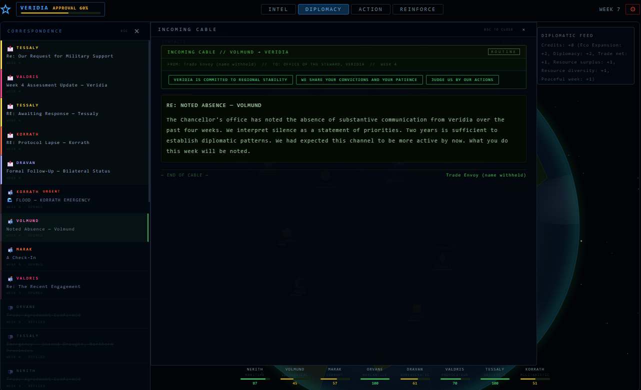 You are the Steward of Veridia — a nation surrounded by seven others, each with their own agenda.