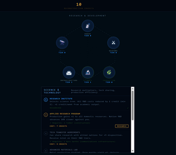 - R&D pentagon — 6 research trees with branching paths (radar, weapons, infrastructure, production, intelligence, science)